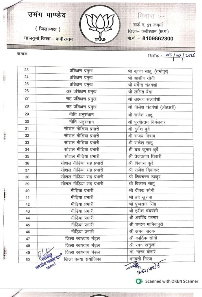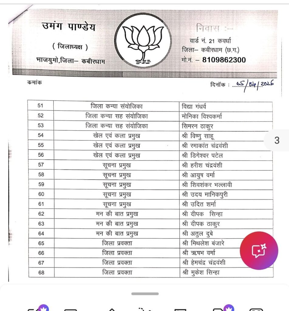 कवर्धा भाजयुमो में नई टीम का गठन, जिला पदाधिकारियों की घोषणा