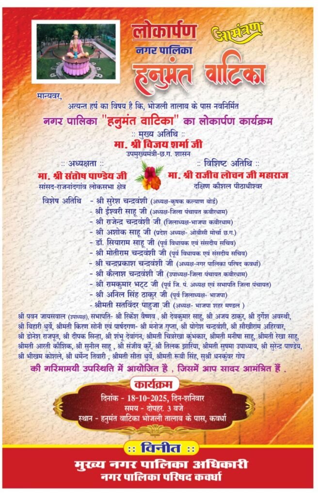 हनुमंत वाटिका का लोकार्पण 18 अक्टूबर को दोपहर 3 बजे होगा। कार्यक्रम में मुख्य अतिथि के रूप में उपमुख्यमंत्री विजय शर्मा, सांसद राजनांदगांव लोकसभा क्षेत्र संतोष पांडेय, दक्षिण कौशल पीठाधीश्वर राजीव लोचन जी महराज, कृषक कल्याण बोर्ड के अध्यक्ष सुरेश चंद्रवंशी, जिला पंचायत अध्यक्ष ईश्वरी साहू, जिला भाजपाध्यक्ष राजेन्द्र चंद्रवंशी,ओबीसी मोर्चा प्रदेश अध्यक्ष अशोक साहू, पूर्व विधायक सियाराम साहू, पूर्व संसदीय सचिव मोतीराम चंद्रवंशी, नगर पालिका अध्यक्ष चंद्रप्रकाश चंद्रवंशी, जिला पंचायत उपाध्यक्ष कैलाश चंद्रवंशी, पूर्व जिला पंचायत अध्यक्ष रामकुमार भट्ट, पूर्व नगर पालिका अध्यक्ष अनिल ठाकुर, शहर भाजपा मंडल अध्यक्ष श्रीमती सतविंदर पाहुजा, नगर पालिका उपाध्यक्ष पवन जायसवाल सहित सभापतिगण, पार्षदगणों की उपस्थित में संपन्न होगा।