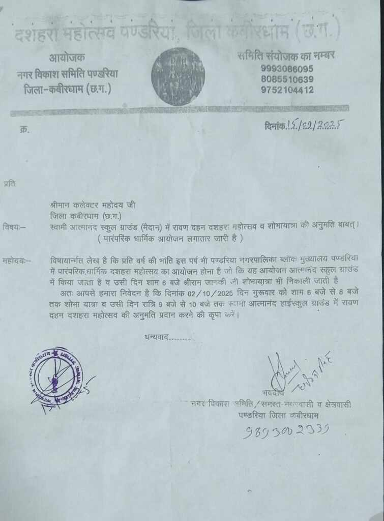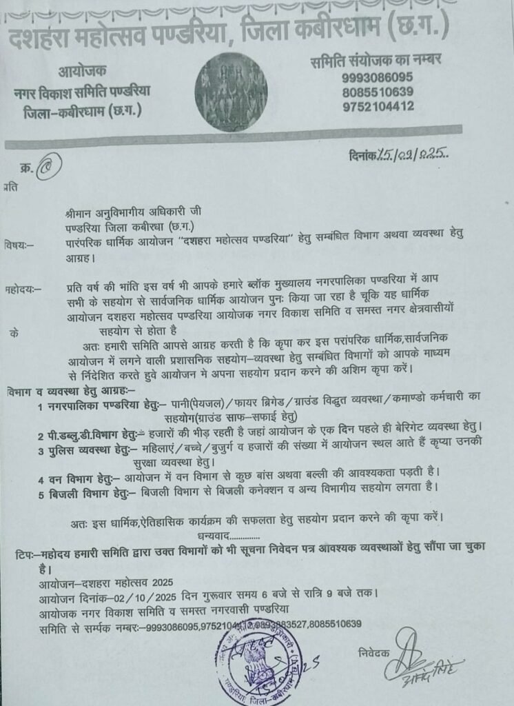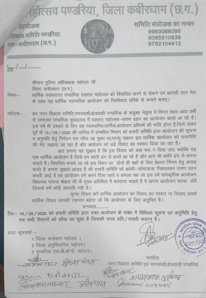 उल्लेखनीय है कि उक्त आयोजन हेतु संबंधित विभाग , एस.डी.एम कार्यालय.पंडरिया सहित अन्य सभी विभागों को 15 सितंबर 2025 को ही आयोजन कि सूचना व अनुमति हेतु आवेदन दे दिया गया था परंतु अधिकारी द्वारा राजनीतिक दबाव के चलते नगर विकास समिति को आयोजन की अनुमति नहीं दी जा रही है वही भाजपा विधायक श्रीमती भावना बोहरा जी के मुख्य आतिथ्य मे महामाया दुर्गा उत्सव समिति के आवेदन पर यह आयोजन करने हेतु विभागीय अनुमति देकर आयोजन में राजनीति धार्मिक विवाद सामने कर दिया गया है जिसकी जितनी निंदा की जाए कम है ।