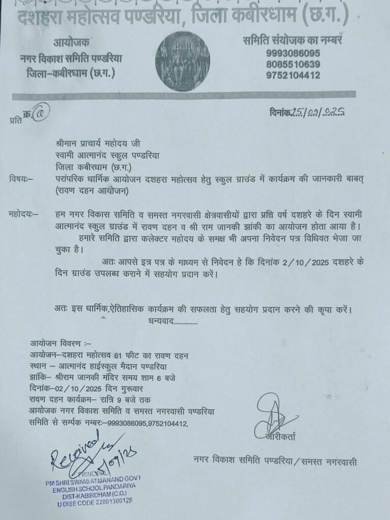 पंडरिया नगर में दशहरा महोत्सव कई वर्षों से बंद था जिसे नगर विकास समिति के बैनर तले अथक मेहनत कर सभी नगरवासियो, क्षेत्रवसियों के सहयोग से पुनः आरम्भ किया गया था जो लगातार सात वर्षों से परंपरागत रूप से आत्मानंद स्कुल के मैदान मे आयोजित होते आ रही है। पंडरिया की शान बन चुके नगर विकास समिति द्वारा आयोजित दशहरा महोत्सव को गंदी राजनीति के भेट चढ़या जा रहा है जो कि दुर्भाग्य पूर्ण है व उक्त राजनीतिक के कारण सभी वर्गों ,समुदायों और नगर सहित क्षेत्रवासियो में भारी नाराजगी देखने को मिल रही । ज्ञात हो कि यह आयोजन नगर विकास समिति के तत्वाधान में समस्त पंडरिया नगरवासी एवं क्षेत्रवासियो के सहयोग से आयोजित होता आया है आयोजन का पूरा संचालन आनंद सिंह व उनकी पूरी टिम करती आई है ।