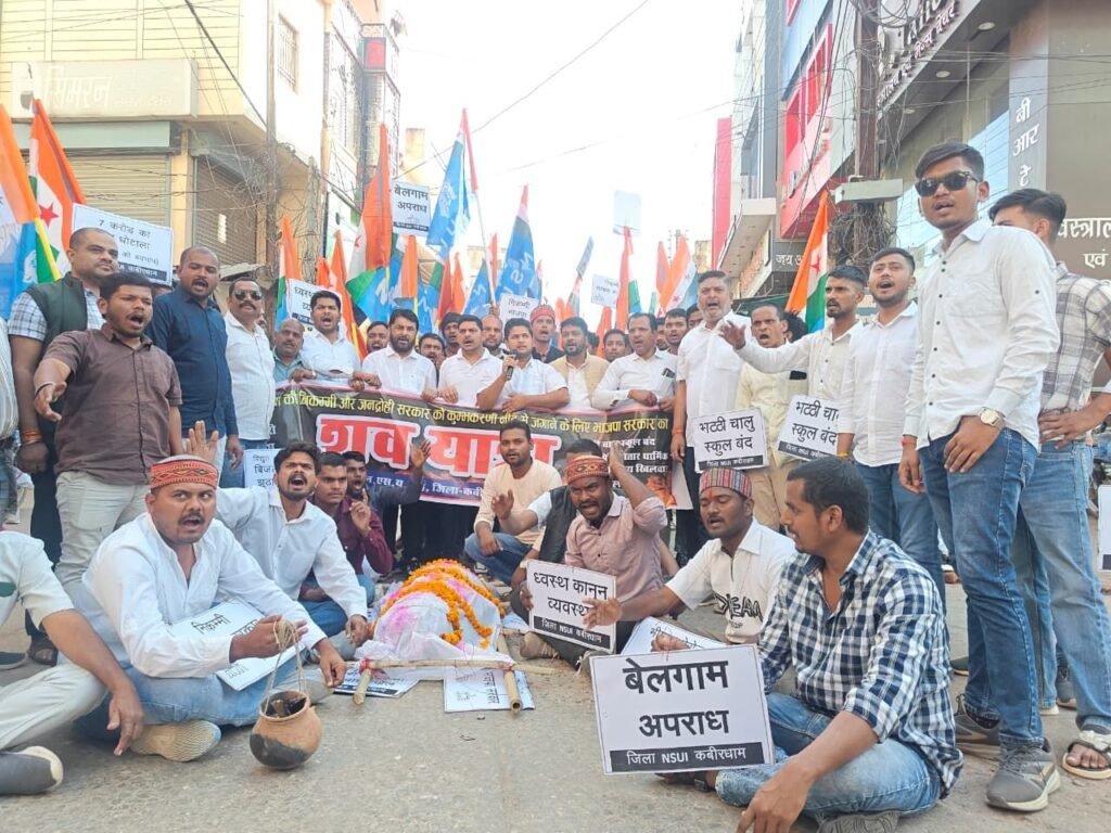 छत्तीसगढ़ में भाजपा की निकम्मी,जनद्रोही और असंवेदनशील सरकार के खिलाफ भारतीय राष्ट्रीय छात्र संगठन (NSUI) के जिलाध्यक्ष शितेष चन्द्रवंशी के नेतृत्व मे जोरदार विरोध प्रदर्शन करते हुए प्रतीकात्मक शव यात्रा निकाली गई। इस शव यात्रा के माध्यम से भाजपा सरकार की विफल नीतियों, झूठे वादों और छात्र-युवा विरोधी सोच का सार्वजनिक रूप से पर्दाफाश किया गया।