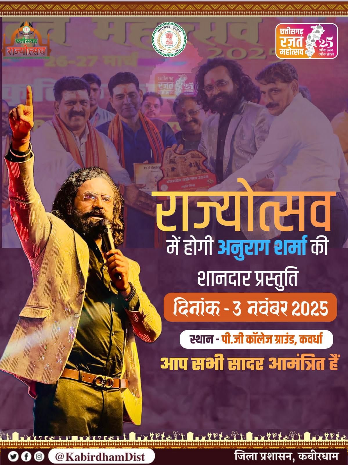 कवर्धा, 03 नवम्बर 2025। उपमुख्यमंत्री विजय शर्मा के विशेष आमंत्रण पर छत्तीसगढ़ के लोकप्रिय और प्रतिष्ठित गायक अनुराग शर्मा अपने अद्वितीय संगीत से छत्तीसगढ़ी लोक संगीत की दुनिया को नया आयाम देने के लिए कबीरधाम जिले के राज्योत्सव में आज 03 नवंबर को अपनी शानदार और मधुर प्रस्तुति देने आ रहे हैं। रात 8 बजे से उनका कार्यक्रम राज्योत्सव स्थल पीजी कॉलेज मैदान में प्रारंभ होगा। अनुराग शर्मा का संगीत छत्तीसगढ़ी लोक संगीत में एक महत्वपूर्ण स्थान रखता है। उनके द्वारा गाए गए गीत जैसे “सूट गा रे भैया”, “छत्तीसगढ़ के मया”, “मोर रानी”, और “आवो घर रे भैया” ने न केवल छत्तीसगढ़ बल्कि देशभर में अपनी एक अलग पहचान बनाई है। इन गीतों में छत्तीसगढ़ की संस्कृति, लोककला और जीवन शैली की झलक मिलती है। उनकी आवाज़ में जो सहजता और माधुर्य है, वह हर आयु वर्ग के श्रोताओं को अपनी ओर आकर्षित करती है। अनुराग शर्मा की संगीत यात्रा में कई पुरस्कार और सम्मान उन्हें प्राप्त हुए हैं, और वे आज छत्तीसगढ़ के सबसे प्रभावशाली और लोकप्रिय गायकों में से एक माने जाते हैं।