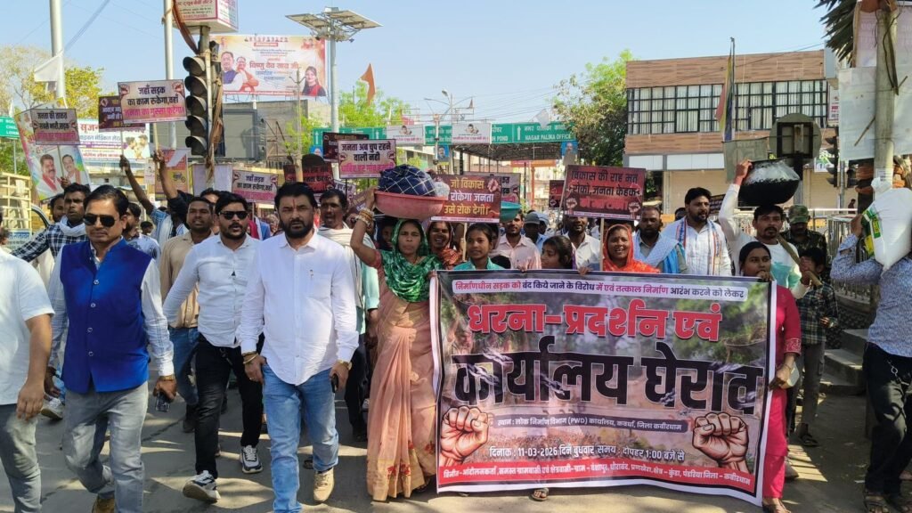कवर्धा। पंडरिया विधानसभा क्षेत्र के बंसाशापुर–प्राणखैरा–आमादाह–धोराबंद मार्ग के रुके हुए सड़क निर्माण को लेकर आखिरकार जनता का आक्रोश फूट पड़ा। सैकड़ों की संख्या में ग्रामीण महिला, पुरुष, युवा, मजदूर, किसान, बुजुर्ग और बच्चे चूल्हा-बर्तन, डेरा-डंडी, रापा और गैती लेकर कवर्धा स्थित लोक निर्माण विभाग (PWD) कार्यालय पहुंच गए और जोरदार रैली निकालते हुए कार्यालय का घेराव कर दिया।