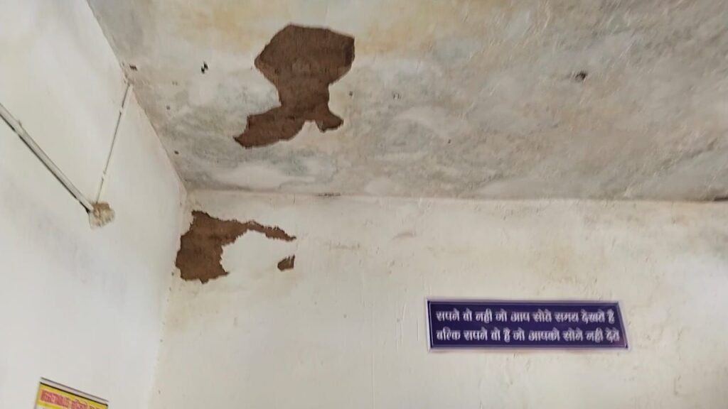 अभी बारिश का दौर जारी है,ऊपर छत में पानी भरने के कारण सीपेज आकर पलस्तर पूरे तरह गिर रहे है,,कही हादसा का शिकार न हो जाए छोटे छोटे स्कूली मासूम बच्चे
